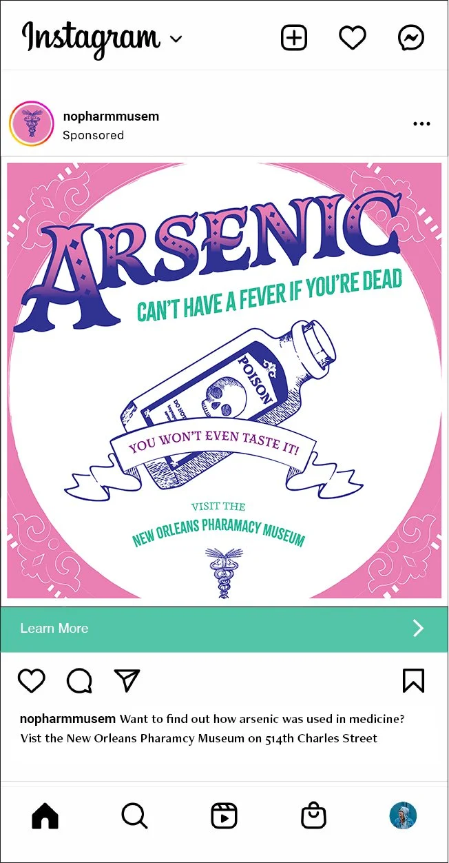 The ad campaign’s design pulls from the eclectic style of Victorian ads with illustrations and chromatic type, which hints at the museum’s apothecary-like building. Deviating from the muted, Victorian colors, the campaign features bright pink, green, and purple. The voice pulls from marketing tactics seen throughout the eras with taglines and information to try and persuade the viewer—the shocking, yet humorous nature helps draw the audience’s attention and pique their curiosity.